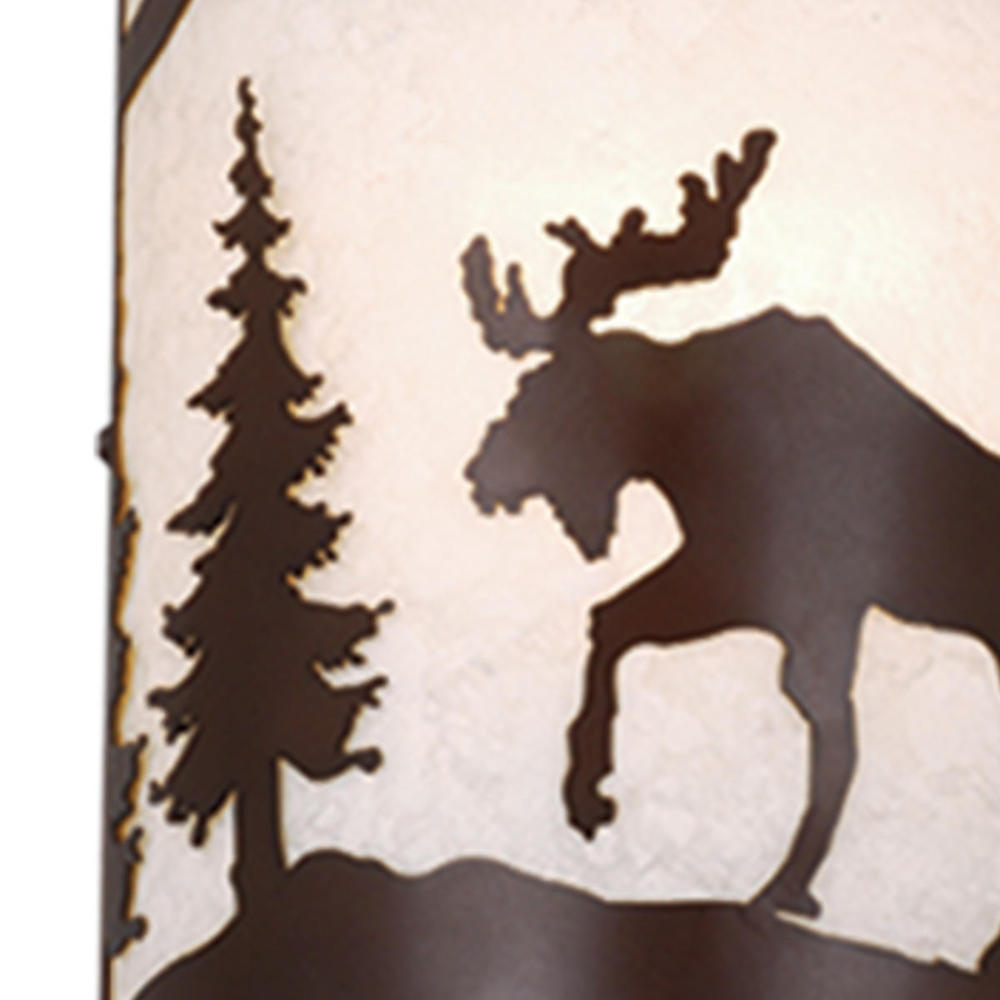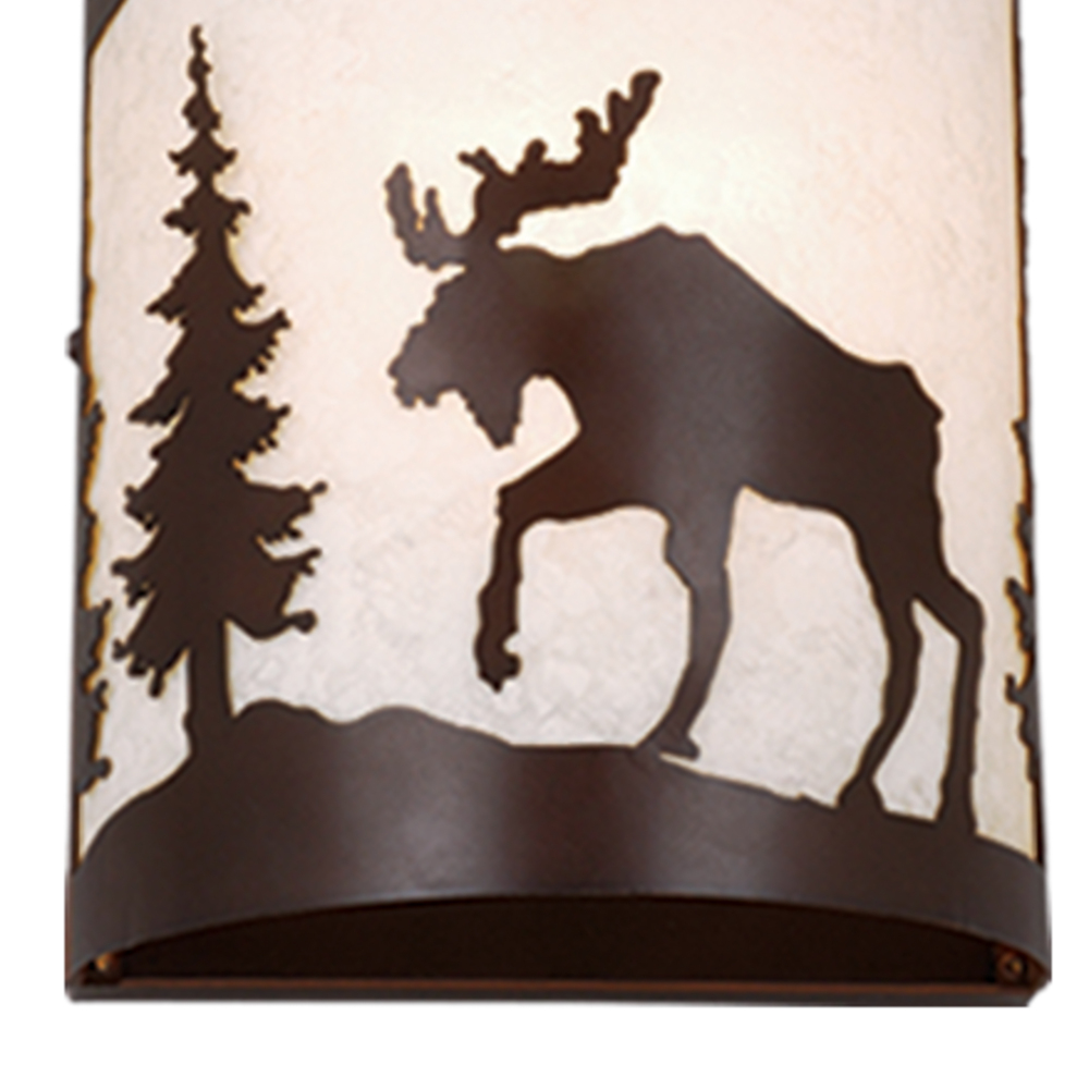 Evoking the spirit of the wilderness, this rustic themed light is clad in a burnished bronze finish and features silhouetted tree and moose imagery atop glowing white tiffany style glass. It is a great choice for a vacation lodge, cabin or suburban home and will complement a variety of home styles: anywhere you want to bring an element of nature. This versatile light is outdoor damp rated and can be used indoors as well as outdoors. Mount these lights on your porch, hallway, or entryway and experience this stylish look for yourself.