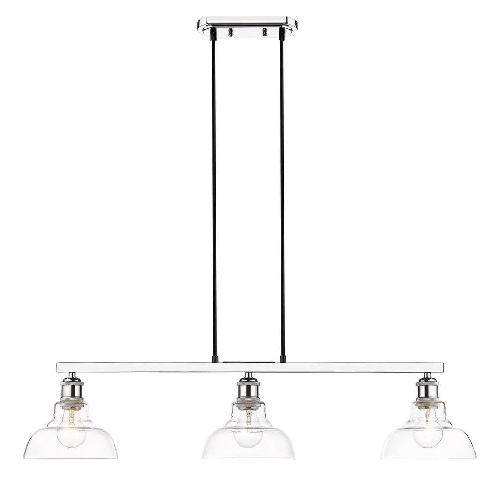 Bring modern elegance into your home with the Yep by Golden Lighting Carver 3-light Semi-Flush Mount in Chrome. Featuring clear glass shades and a polished chrome frame, it creates a welcoming atmosphere. The clear glass shade offers brilliant, unobstructed light, showcasing the beauty of the bulbs and fixture design. With a polished finish, this fixture brings a touch of brightness and polished perfection to your space. The brilliant and timeless finish provides a sleek and sophisticated look, seamlessly integrating into various decor styles. This semi-flush mount is ideal for rooms with mid-height ceilings such as entryways, bedrooms, kitchens, and living areas. It is damp location rated, making it suitable for bathrooms and covered porches. Customize the fixture’s length to suit your ceiling height for the perfect look. Dimensions: 35.5"W x 11.13"H x 7.63"D. Requires 3 E26 medium base bulbs (not included, max 60 wattage per bulb). Elevate your home decor with this high-quality, stylish fixture that enhances any room's ambiance.
