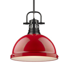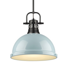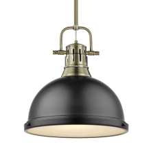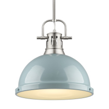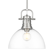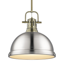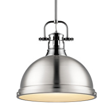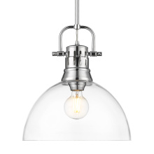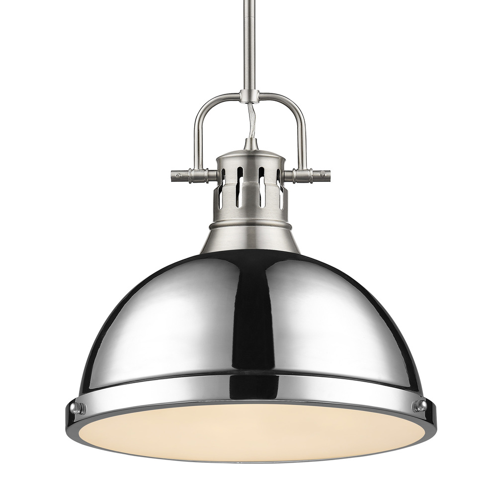 Bring farmhouse elegance into your home with the Yep by Golden Lighting Duncan 1-light 14in Rod Hung Pendant. Featuring a metal shade and a pewter frame, it creates a welcoming atmosphere. The chrome detail adds a bright, cool-toned silver accent that elevates your decor while providing a stunning, high-shine gleam. Our Pewter finish offers a soft and classic alternative to brighter silver tones, created using a durable electroplating process for an elegant, non-glare glow. This versatile fixture is suitable for kitchens, dining rooms, and entryways, and is damp location rated for covered and semi-enclosed spaces. It is easily installed on sloped ceilings and has an adjustable height ranging from 22.875" to 58.875". Overall dimensions are 14"W x 14.63"H x 14"D, requiring 1 E26 Medium base bulb (not included, max 100 wattage per bulb). Close with the charm of this timeless piece, elevating your home style with quality craftsmanship.