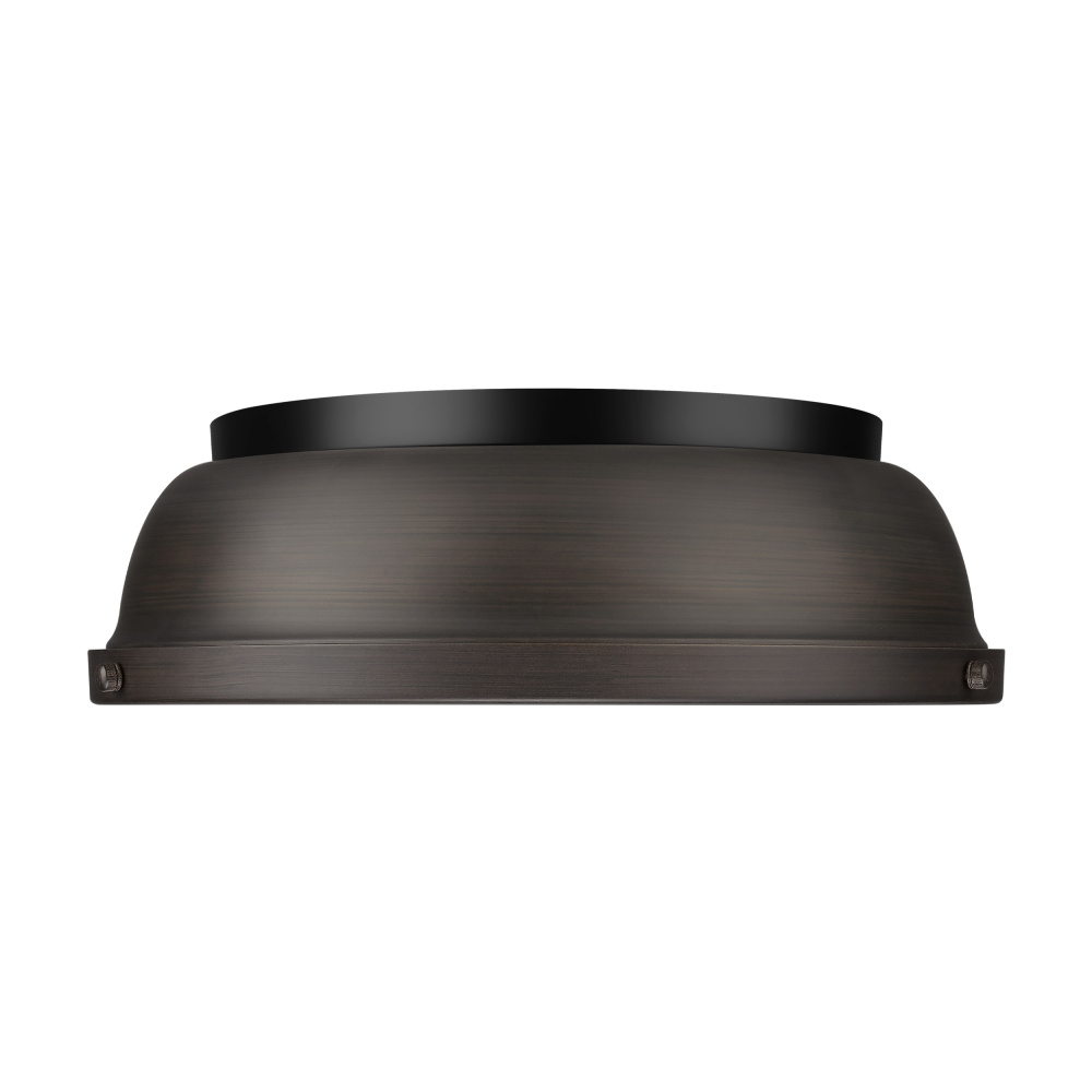 Bring timeless farmhouse elegance into your home with the Yep by Golden Lighting Duncan 2-light Flush Mount. Featuring a metal shade and a matte black frame, it creates a welcoming atmosphere in any space. The Rubbed Bronze finish provides a rich, dark brown color with coppery highlights that enhances the overall design. The matte black finish offers a smooth, non-reflective surface that absorbs light and reflects an understated elegance. Ideal for low ceilings, this fixture is suitable for hallways, closets, bathrooms, and laundry areas. It is damp location rated, making it perfect for covered and semi-enclosed spaces with occasional moisture. Requires 2 E26 Medium base bulbs (not included) with a max wattage of 60 per bulb. Dimensions are 14"W x 4.25"H x 14"D, delivering wide illumination to create a warm ambiance. Enhance your decor with this fixture that beautifully blends style and functionality.