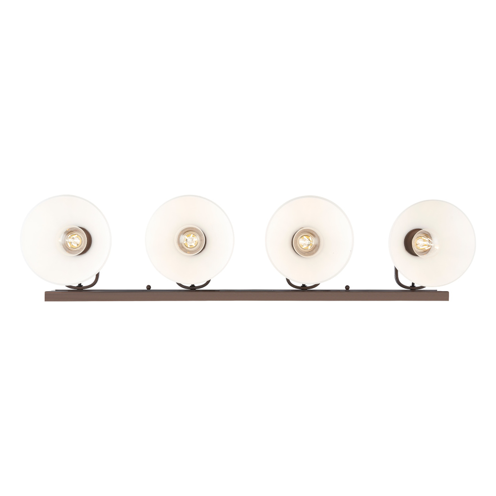 Bring traditional elegance into your home with the Yep by Golden Lighting Hines 4-light Vanity in Rubbed Bronze and Opal Glass. Featuring an opal glass shade and a rubbed bronze frame, it creates a welcoming atmosphere. The opal glass shade diffuses light evenly for a soft, glare-free glow, providing a timeless and elegant appeal. Our Rubbed Bronze finish brings a touch of classic warmth to any design, celebrated for its rich, deep brown base accented by gentle highlights of bronze. Ideal for brightening up bathrooms with task illumination, this fixture is damp location rated, suitable for areas with occasional moisture, and adjustable directional heads allow for customized lighting. Overall Dimensions: 34.63"W x 8.75"H x 8.25"D Requires 4 E26 Medium base bulbs (not included), max 60 watt each. This vanity light not only serves as a practical solution but also as a stylish statement, bringing both quality and charm to your space.
