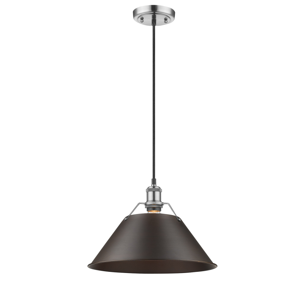 Bring industrial elegance into your home with the Yep by Golden Lighting Orwell 1-light 14in Pendant in Pewter and Rubbed Bronze. Featuring a metal shade and a pewter frame, it creates a welcoming atmosphere. The rubbed bronze shade, with its rich, dark brown color and subtle coppery highlights, allows for a warm, inviting glow while adding depth and character. Our pewter finish offers a timeless appeal, perfect for both classic and contemporary interiors. Designed for versatility, it's damp location rated, making it suitable for covered and semi-enclosed spaces, such as bathrooms and porches. Installation is easy with its sloped-ceiling compatibility, and you can customize the hanging length, adjustable from 17.5" to 131.5". Overall dimensions measure 14"W x 10"H x 14"D, requiring 1 E26 medium base bulb (not included) with a maximum wattage of 100. This pendant is not just lighting, it's a stylish statement that embodies quality and sophistication.