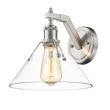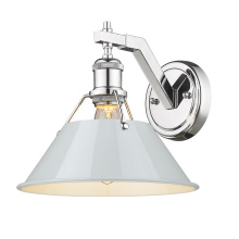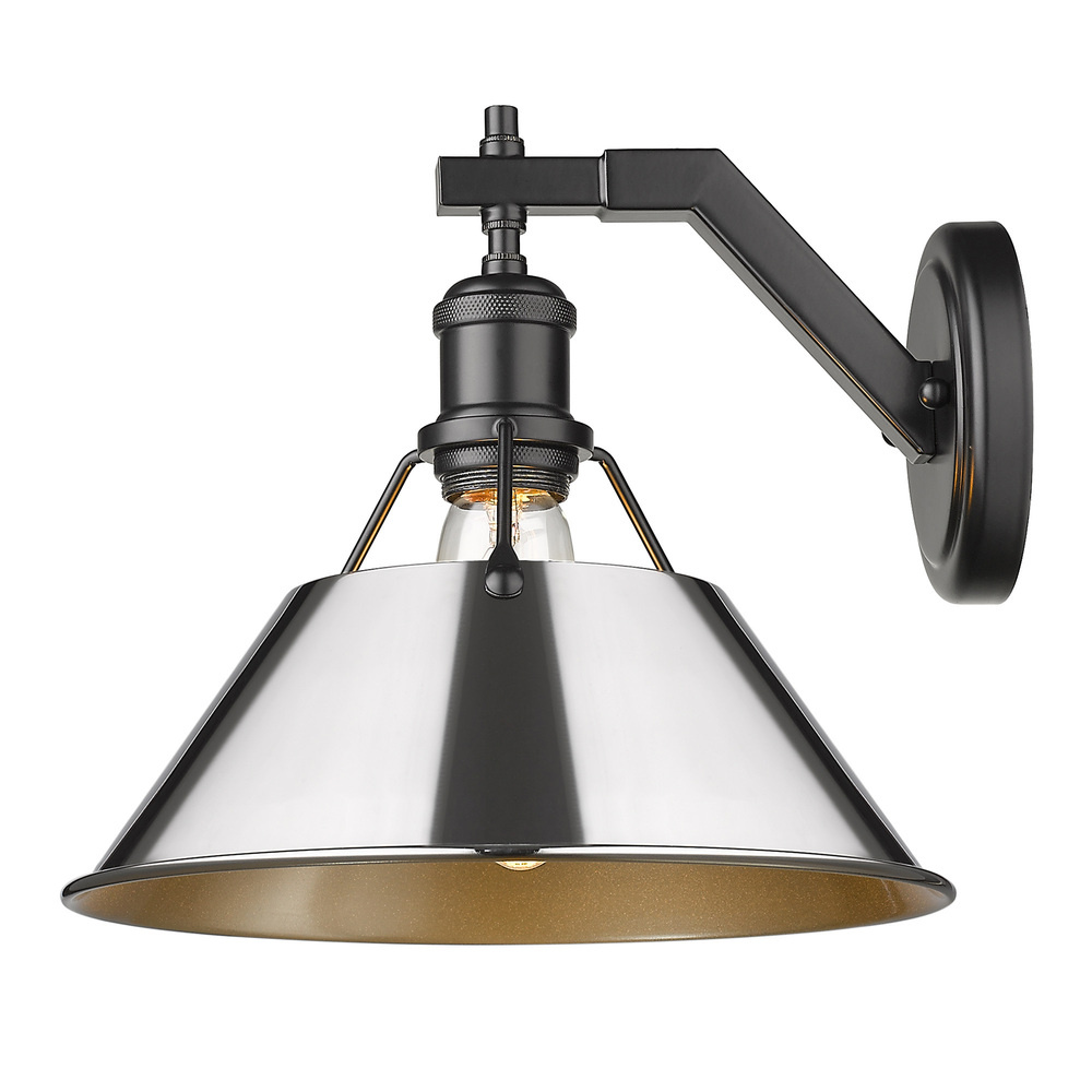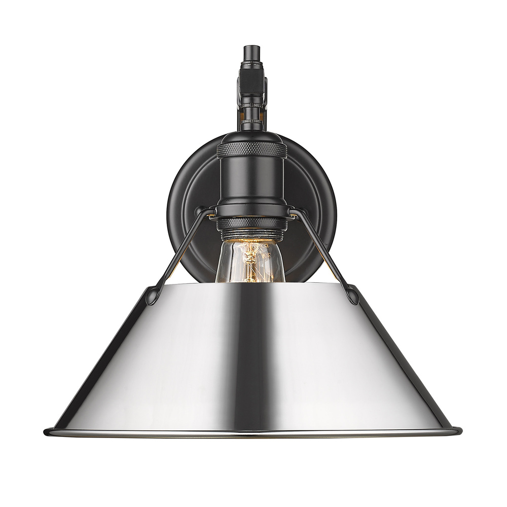 Bring industrial elegance into your home with the Yep by Golden Lighting Orwell 1-light Wall Sconce. Featuring a chrome shade and a matte black frame, it creates a welcoming atmosphere. The chrome shade is electroplated to produce a highly reflective, mirror-like sheen, enhancing any decor with its brilliant and timeless appeal. The matte black finish complements this design perfectly, offering understated elegance. Ideal for hallways, stairways, and bathrooms, this wall sconce is Damp Location Rated, making it suitable for covered and semi-enclosed spaces with occasional moisture. Installation is straightforward, and it requires 1 E26 Medium base bulb (not included) with a maximum wattage of 100. With overall dimensions of 10"W x 9.63"H x 11"D, this sconce brightens your space with a distinctive style, making it an ideal addition to your home.