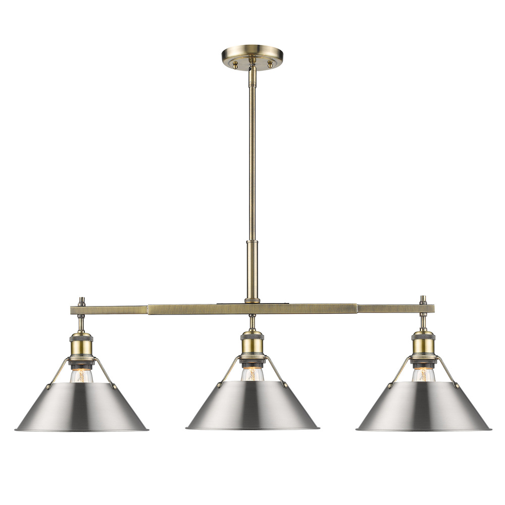 Bring industrial elegance into your home with the Yep by Golden Lighting Orwell 3-light Island Light. Featuring a metal shade and an aged brass frame, it creates a welcoming atmosphere. The metal shade, finished in Pewter, has a fine brushed texture that allows light to diffuse without glare, enhancing the warm glow. Embrace timeless elegance with our Aged Brass finish, which offers a warm, inviting glow reminiscent of vintage heirlooms. It's perfect for adding a touch of understated luxury to traditional, transitional, or industrial-inspired spaces. Ideal for kitchen islands, this fixture is dry location rated for indoor spaces not subject to moisture. It is easily installed on angled ceilings and features an adjustable height from 17.125" to 59.125". Overall dimensions are 35.75"W x 14.5"H x 10"D, and it requires three E26 Medium base bulbs (not included), each with a maximum wattage of 100. Elevate your home decor with the quality and style of Yep by Golden Lighting.