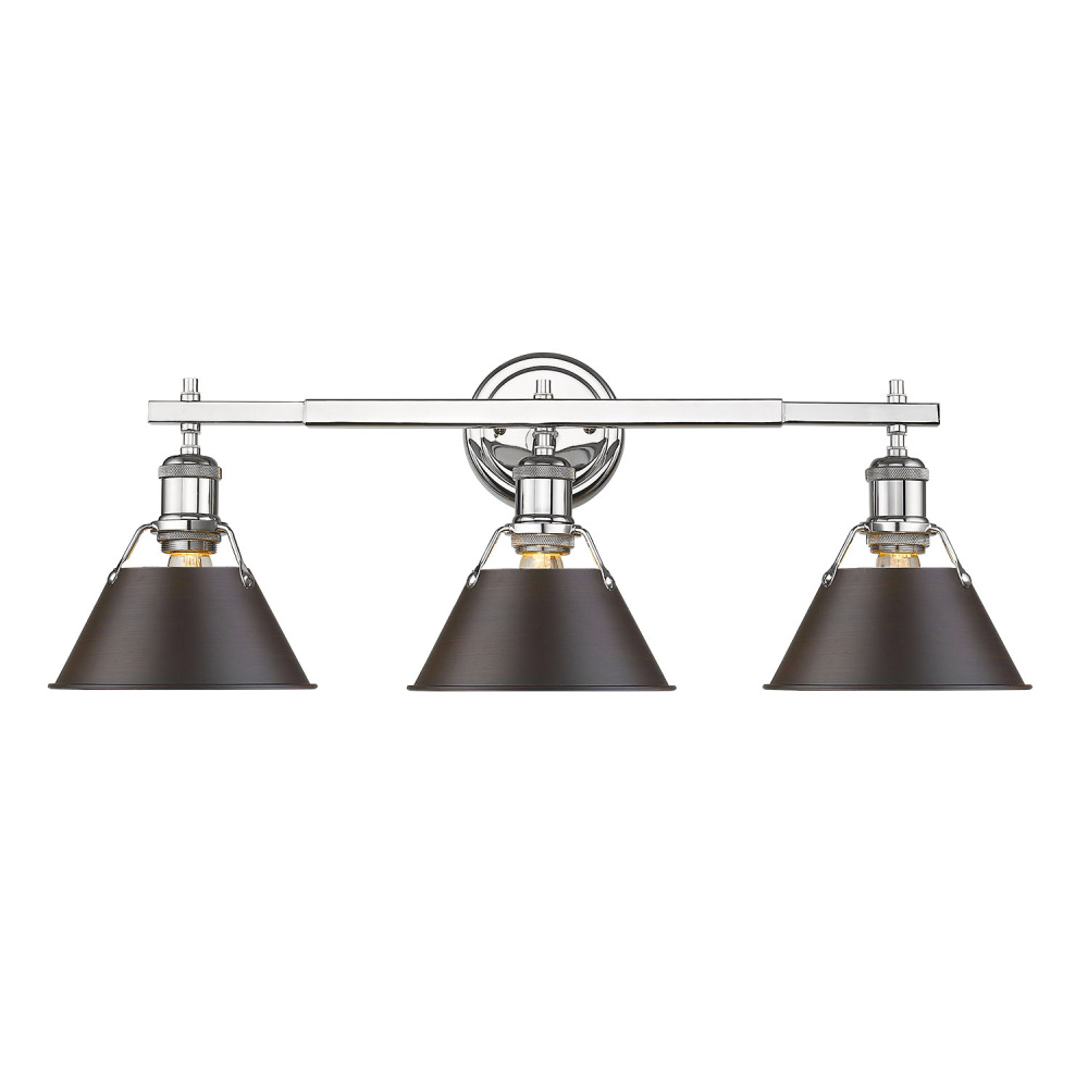 Bring industrial elegance into your home with the Yep by Golden Lighting Orwell 3-light Vanity. Featuring a rubbed bronze shade and a polished Chrome frame, it creates a warm and inviting atmosphere. The metal shade in rubbed bronze is a timeless choice that adds depth and warmth with subtle highlights of coppery bronze while providing soft, diffused light. The brilliant and timeless Polished Chrome finish offers a crisp, clean look that elevates any space, integrating seamlessly into a variety of decor styles. This finish is created using a durable electroplating process, making it easy to keep clean while adding polished perfection. Ideal for brightening up bathrooms with dedicated lighting that flatters, the vanity light is damp location rated, suitable for covered and semi-enclosed spaces. It requires 3 E26 Medium base bulbs (not included), with a maximum wattage of 100 per bulb, and has overall dimensions of 27.25"W x 9.88"H x 8.5"D. Enhance the functionality of your space while embracing style and quality with this stunning fixture.
