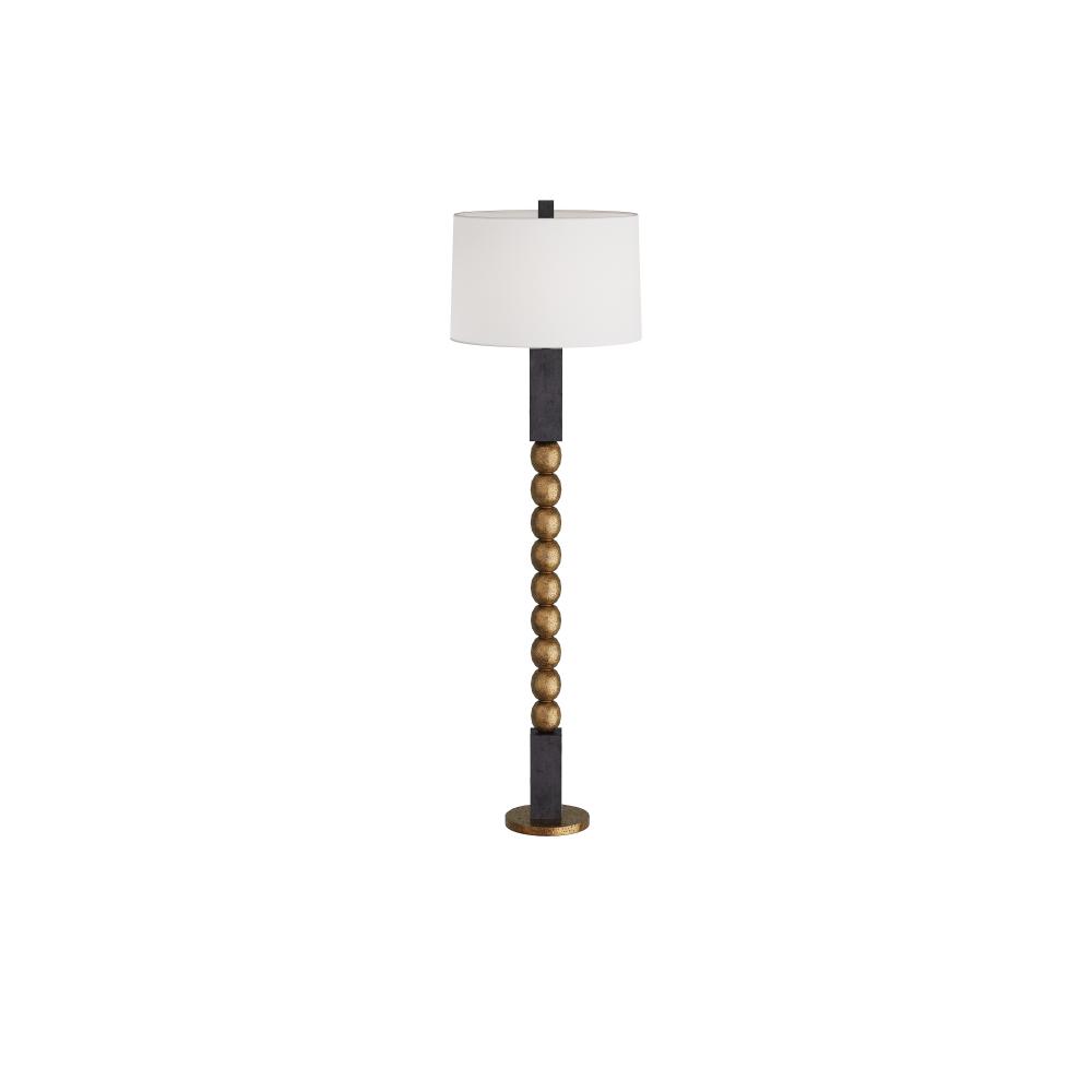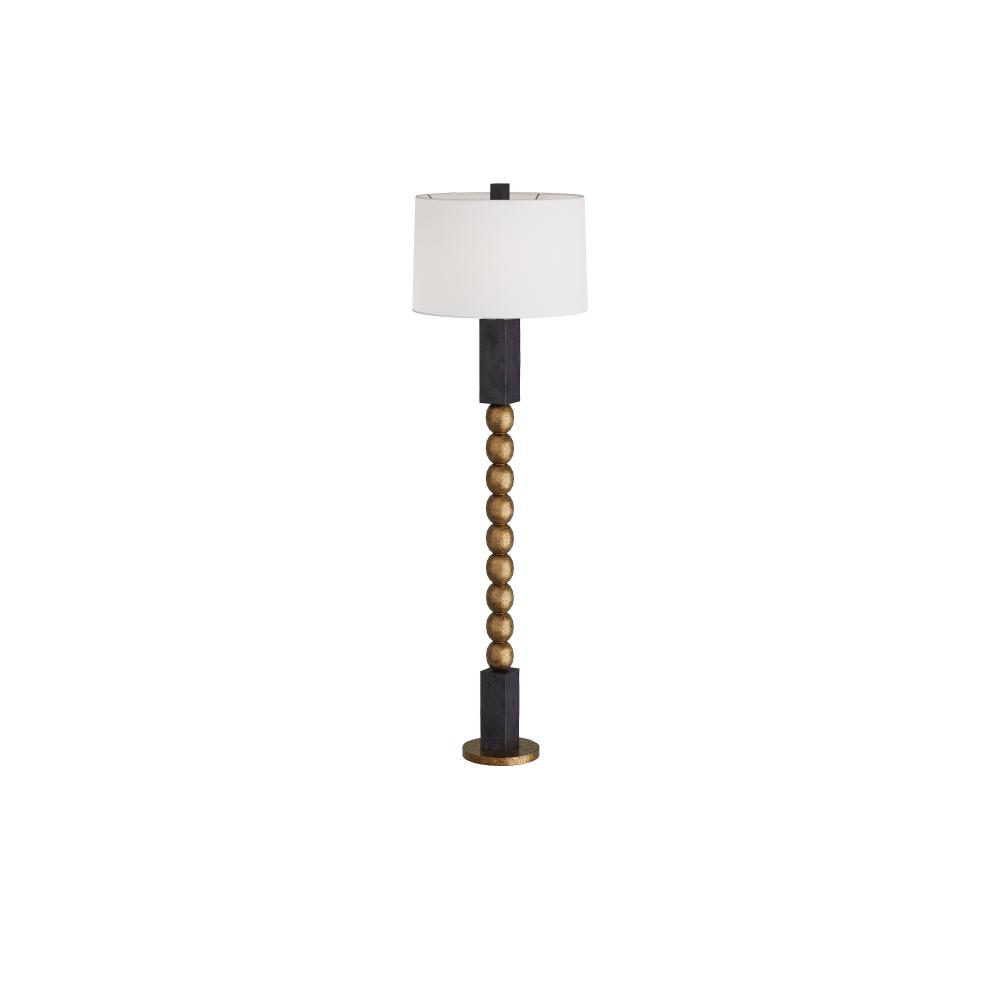 Texture on texture elevates the modern Yonah. Blocks of ebonized mango wood border a totem of antique brass spheres. Bringing the best of the natural and modern worlds together, its sculptural form is finished with a drum shade of white linen. Clear silver cord and three-way rotary switch.