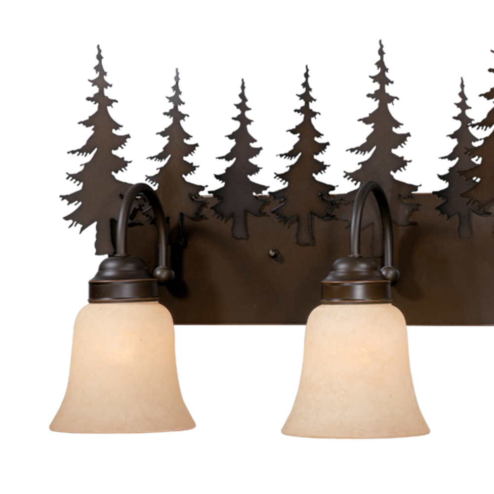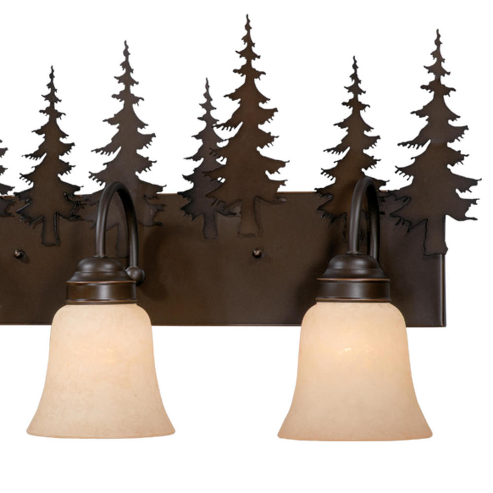 Evoking the spirit of the wilderness, this rustic themed light is clad in a burnished bronze finish and features silhouetted tree imagery atop glowing amber flake glass. It is a great choice for a vacation lodge, cabin or suburban home and will complement a variety of home styles: anywhere you want to bring an element of nature. This bathroom light is perfect over medium vanities or as a pair over double sinks.