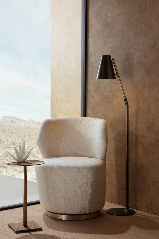 This masculine style offers a modern mix of materials and finishes. A slender vertical rod in English bronze and antique brass finish supports a conical shade of bronze. Mounted on a matching circular base with antique brass accents, it is finished with a taupe cloth cord. Full-range dimmer.