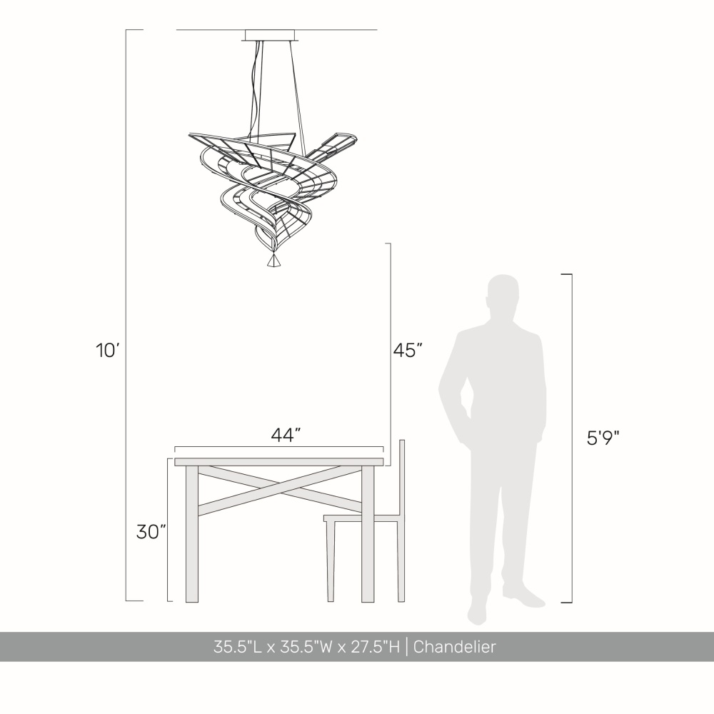 Bring modern elegance into your home with the Ziva by Golden Lighting Aurora Integrated LED 36"W Pendant. Featuring a sleek design with no shade, this fixture embodies contemporary style and sophistication. Crafted from warm-toned, handcrafted acrylic, it showcases a seamless and architectural work of art with flowing, twisting ribbons that beautifully diffuse light. The Brushed Champagne finish offers an understated and elegant take on gold, with a refined texture that perfectly catches the light. Ideal for indoor spaces not subject to moisture, this pendant is perfect for kitchens, dining rooms, or entryways. Easily install on angle ceilings with an adjustable height from 34.5" to 147.75" for customized lighting. Enjoy brilliant, energy-efficient illumination from the integrated LED technology, rated for 4500 lumens and three color temperatures—3000K, 4000K, or 5000K. Overall dimensions: 35.5"W x 27.5"H x 35.5"D. Elevate your home with this exquisite fixture that combines form and function flawlessly. Showroom Only.