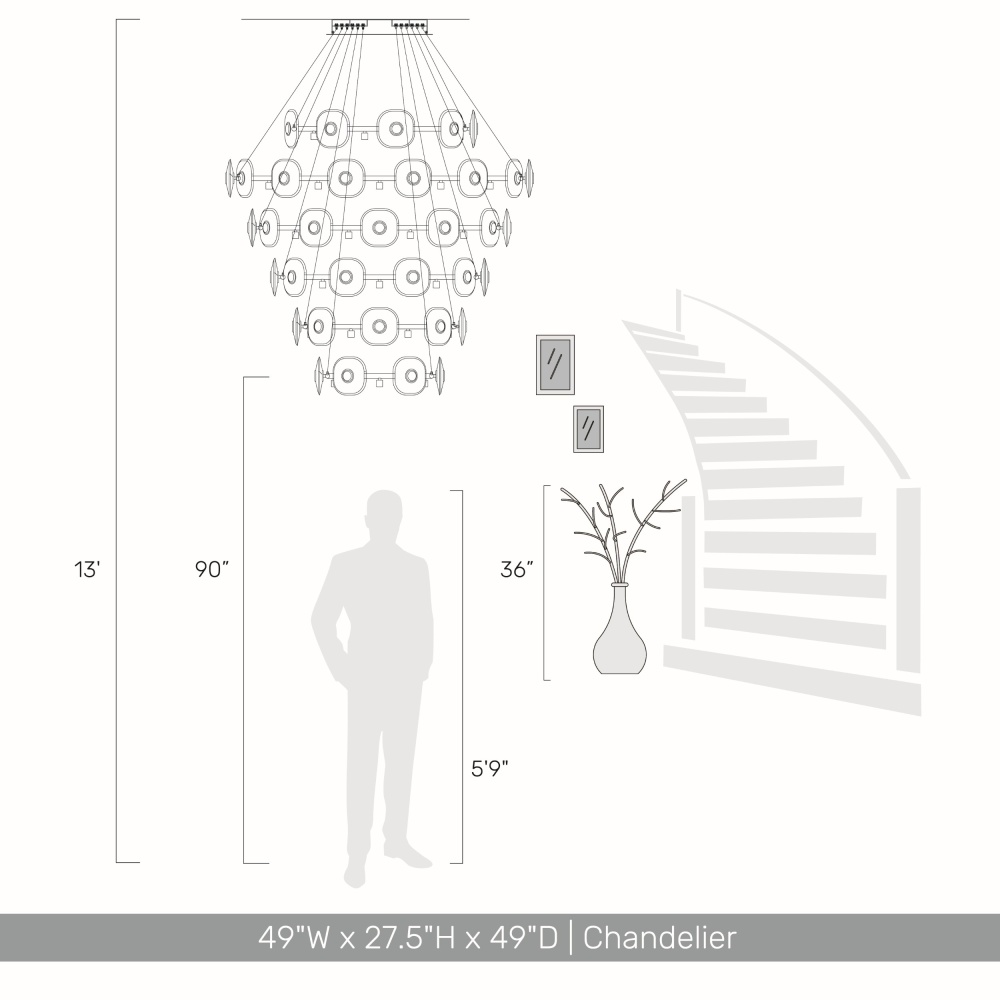 Illuminate your space with the splendid Ziva by Golden Lighting Celestia 59-light Integrated LED Chandelier. This lighting masterpiece is the epitome of modern luxury and sophistication, featuring a striking architectural design that captures attention while providing luxe illumination. Showcasing flawless K9 crystal discs, this chandelier refracts light beautifully, casting a soft halo effect that envelops your living areas in warmth and charm. The brilliant chrome finish offers a polished, reflective surface that complements various interior styles, making it an easy addition to your decor. Perfect for dry locations, this chandelier is ideally suited for dining rooms and large foyers. It’s also adjustable from 102" to 209.75", adapting effortlessly to your space needs. With overall dimensions of 57"W x 72"H x 57"D combined with energy-efficient integrated LED technology, providing 3088 lumens at a warm 3000K color temperature, this chandelier ensures you enjoy both beauty and brilliance. The Ziva by Golden Lighting Celestia 59-light chandelier offers both aesthetic appeal and superior quality for a captivating home atmosphere. Showroom Only.