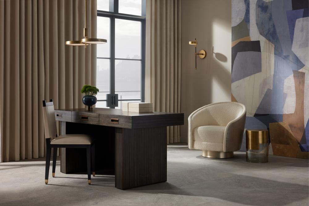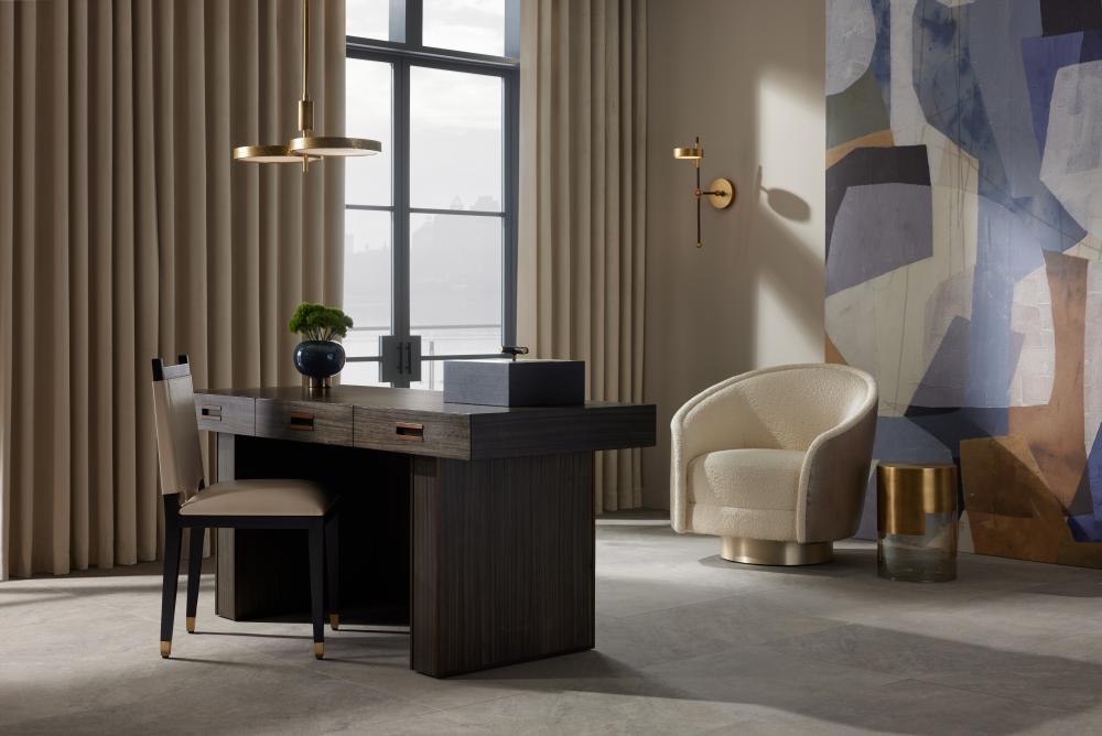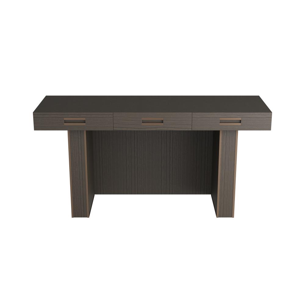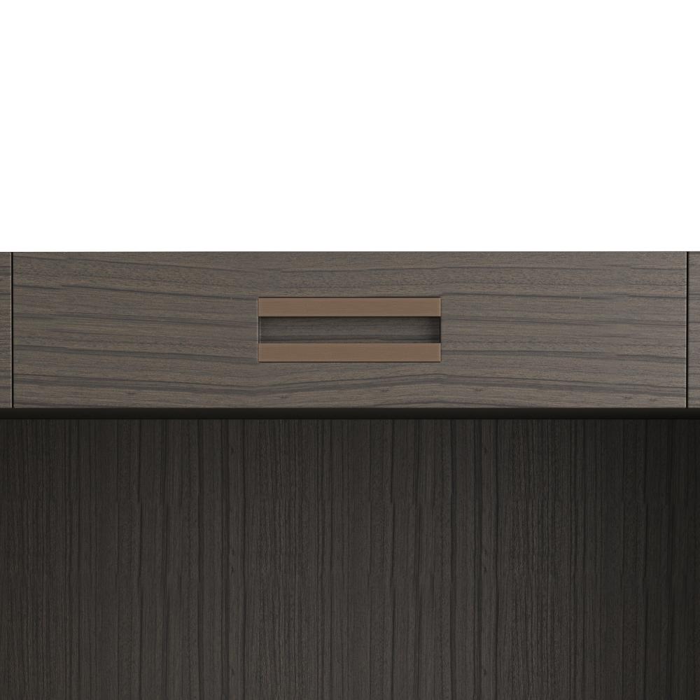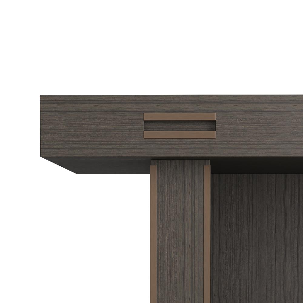 An office essential, our Zola is a refined masculine take on the classic executive's desk. Clad in paldao veneer in an elegant bramble tone, this understated form is finished at every angle to please the eye—from front to back. A trio of soft-close doors is adorned with pulls of antique brass over iron. Finish will vary.
