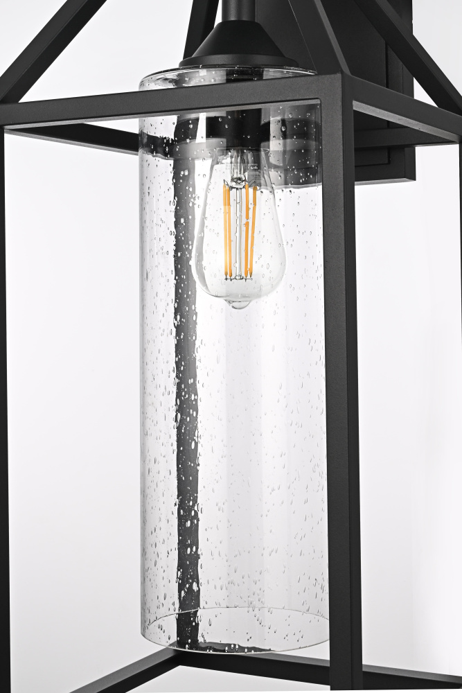This outdoor wall light blends architectural structure with functional lighting, featuring a geometric open-frame design and a peaked top that gives it a bold, defined look. The clear seedy glass cylinder at the center allows the light to shine through while adding subtle texture and depth. Crafted from iron and aluminum, the durable black-finished frame ensures long-term performance in outdoor conditions and is ETL Wet Rated for reliability in entryways, patios, and garage exteriors. Available in 14-inch, 19-inch, and 24-inch heights, this fixture offers versatility to complement different outdoor spaces. The dimmable function allows for adjustable brightness when paired with a compatible dimmer, while the E26 medium-base socket (bulb not included) provides flexibility for different bulb styles. Pre-wired with a 7-inch lead, this wall light is a strong and stylish choice for enhancing outdoor spaces. Built with marine-grade, corrosion-resistant aluminum, this sconce withstands coastal conditions for long-lasting durability.